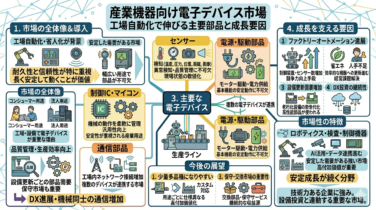 産業機器向け電子デバイス市場を解説。工場自動化、省人化、設備更新が生む成長要因と、センサー・制御ICなど主要部品を整理します。