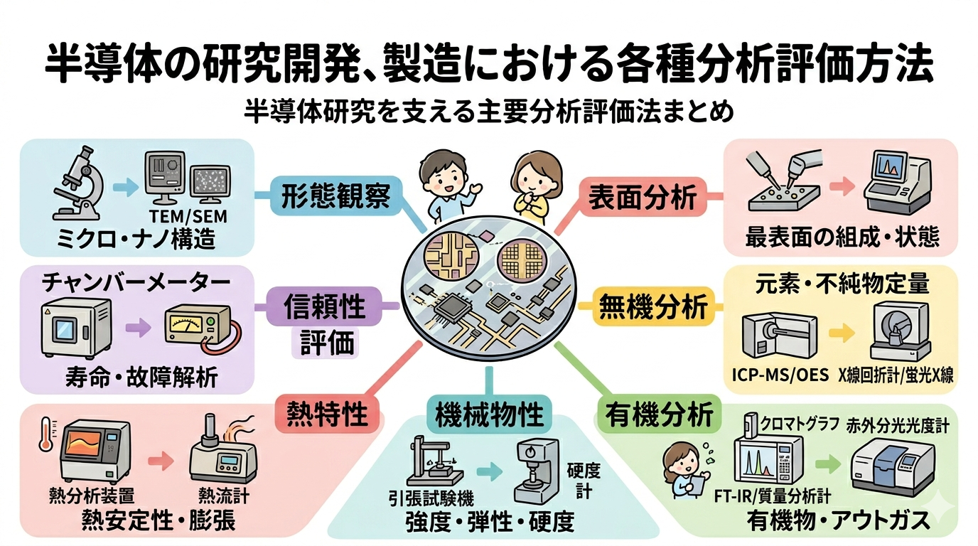 本記事では、半導体分野で利用される主要な分析評価手法を7つのカテゴリ(形態観察、表面分析、無機分析、有機分析、機械物性、熱特性、信頼性評価)に分け、原理と分析対象、そして実務での具体的用途をわかりやすく整理しました。