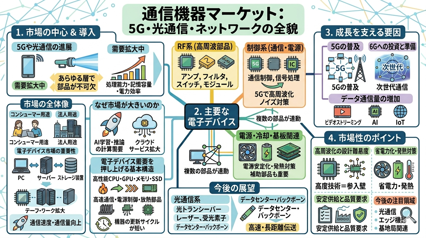 通信機器向け電子デバイス市場は、5G・光通信・AIの普及によって拡大を続けています。