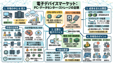 PC・データセンター・ストレージ分野の電子デバイス市場を解説。AI、クラウド、データ増加がもたらす成長要因、主要部品、今後の注目領域を整理します。