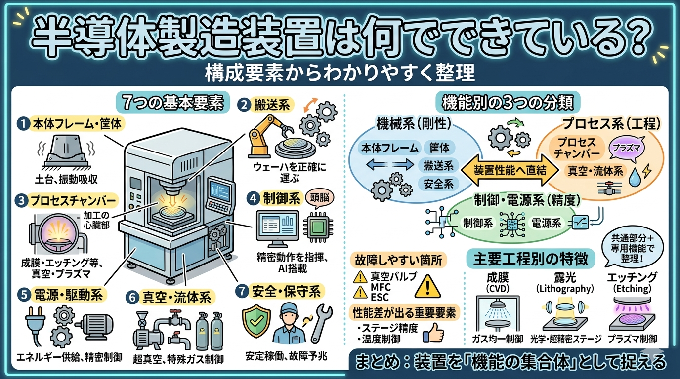 半導体製造装置を構成要素に分解して理解すれば、複雑な装置も「共通基盤+工程専用機能」のシンプルな構造が見えてきます。この視点で性能比較・選定・保守が可能になり、実務力が格段に向上します。
